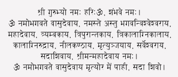 Om Namo Bhagwate Vasudevaya, Namaste astu bhagavan visveshvaraya Mahadevaya Tryambakaya Tripurantakaya Trikalagnikalaya Kalagnirudraya Neelkanthaya Mrityunjayaya Sarveshvaraya Sadashivaya Srimanmahadevaya namah.